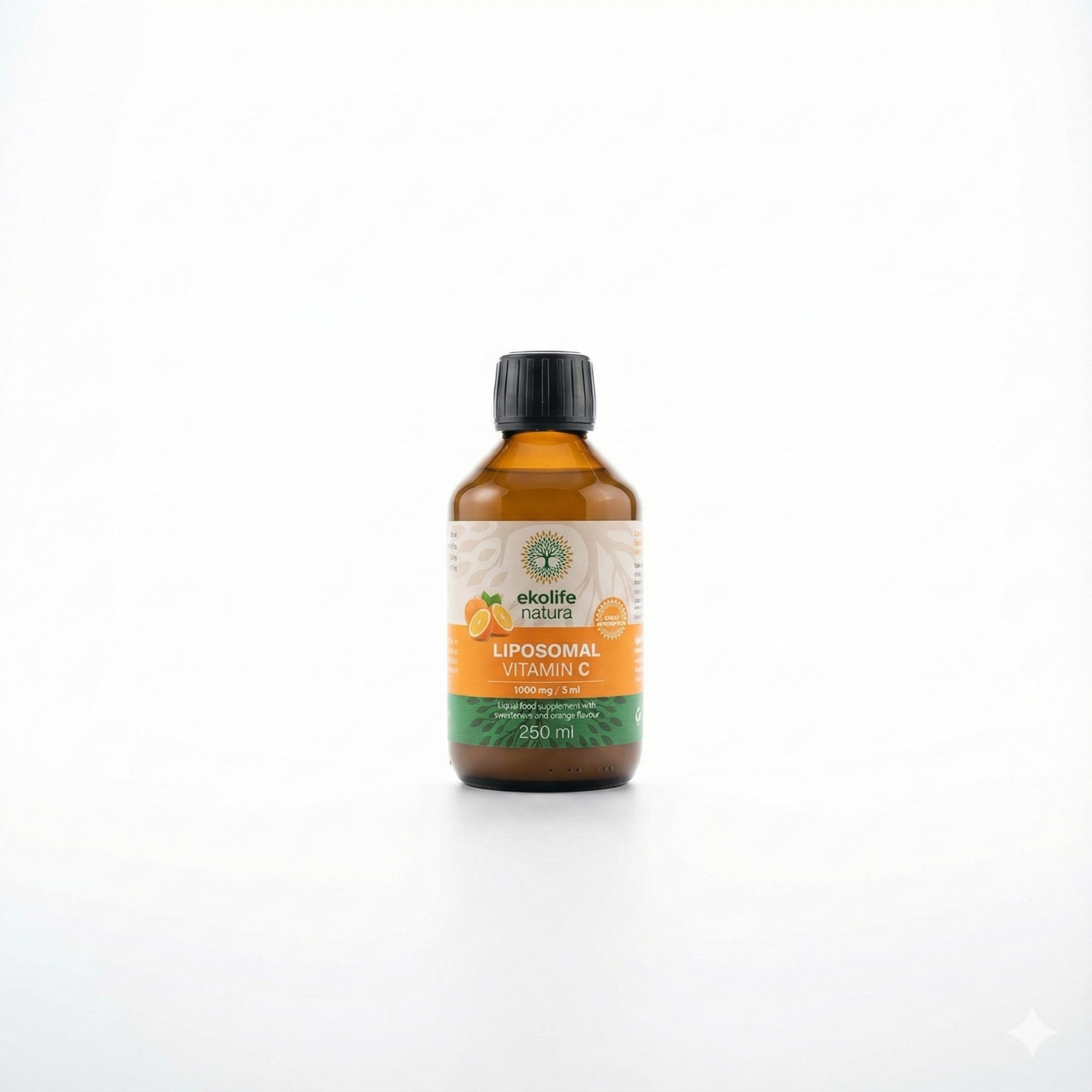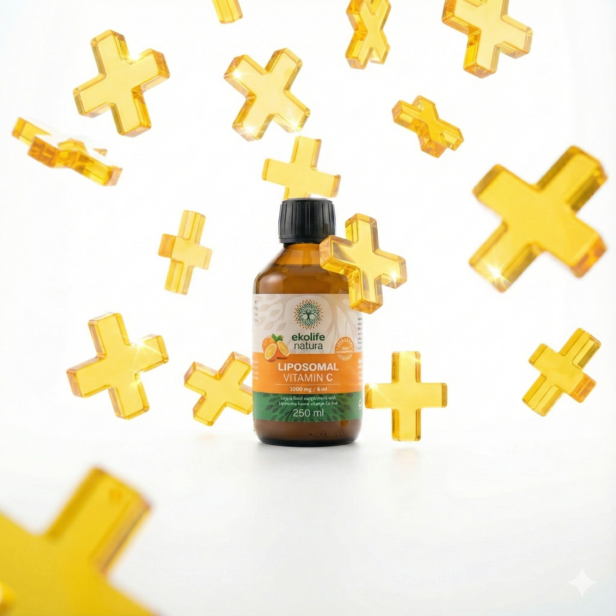 Lipozomální vitamín C Ekolife Natura obsahuje 1000 mg vitamínu C v jedné dávce (5 ml). Lipozomy jsou mikroskopické tukové kuličky, které obalují vitamín a umožňují jeho transport přes buněčnou stěnu. Tato technologie zajišťuje maximální biodostupnost a eliminuje zažívací potíže spojené s vysokými dávkami běžného "céčka". Produkt je slazen přírodními steviol-glykosidy a sukralózou pro lepší chuť.